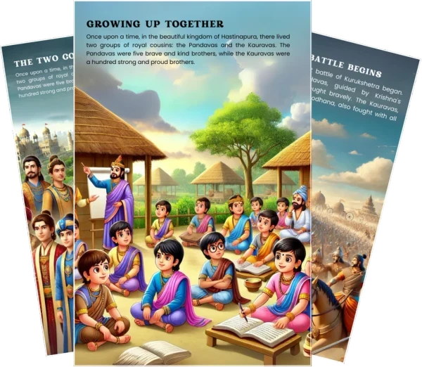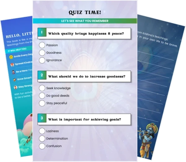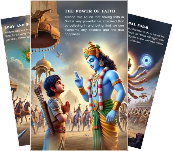 Introducing the “Bhagavad Gita for Kids” – an engaging and interactive e-book designed to make the timeless teachings of the Bhagavad Gita accessible and enjoyable for young minds. This beautifully illustrated guide simplifies complex concepts, presenting them in a fun and impactful manner that resonates with children.